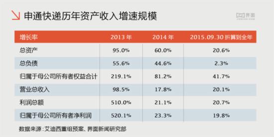 除了此前說到的快遞行業增速下滑,從“三通”中申通速遞的收入、利潤增速規模中也可以驗證這一事實。從艾迪西披露的重大資產重組預案中可以看到,申通的收入以及利潤規模增速大幅放緩,特別是利潤規模的增速自2014年以來快速下滑。除去利潤的大幅萎縮,加盟的風險也日益嚴重。分公司拖欠工資造成快遞堆積如山的新聞報道層出不窮。