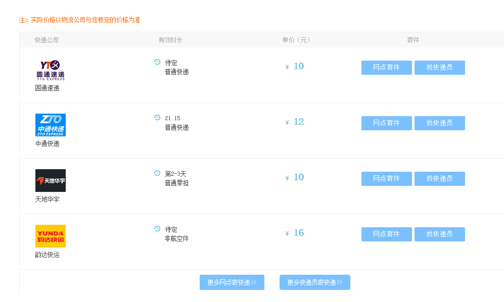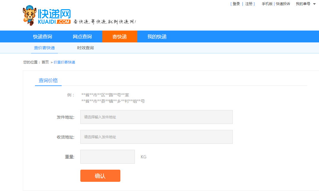 第二步:在“發(fā)件地址”選擇寄件地址,“收件地址”選擇目的地,重量輸入要寄的物品的重量,點“確認(rèn)”,頁面會顯示可以到以選用的快遞,如下圖所示。其中可以看到有“網(wǎng)點寄件”和“找快遞員”