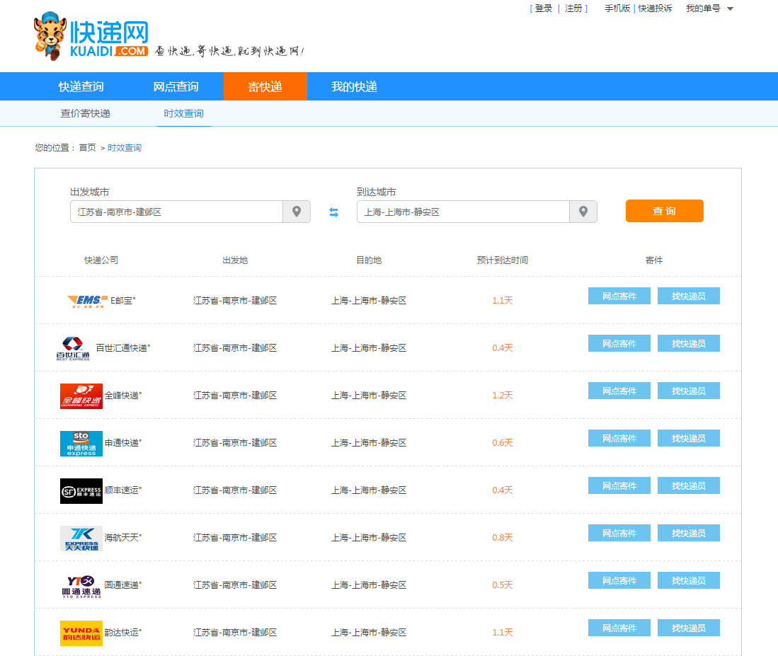 第二步:在了解時效之后,寄快遞有網(wǎng)點寄件和找快遞員兩種途徑,請分別參照方法二和方法一。