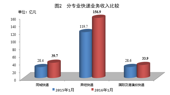1月,同城、異地、國際及港澳臺快遞業務收入分別占全部快遞收入的13.6%、53.8%和11.6%;業務量分別占全部快遞業務量的24.8%、73.2%和2.0%。與去年同期相比,同城快遞業務收入的比重上升0.2個百分點,異地快遞業務收入的比重下降2.9個百分點,國際及港澳臺業務收入的比重下降了2個百分點。
