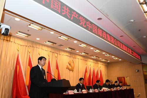 中國郵政集團公司黨組成員、副總經理、直屬機關黨委書記李丕征代表中國共產黨中國郵政集團公司直屬機關第一屆委員會作大會報告。