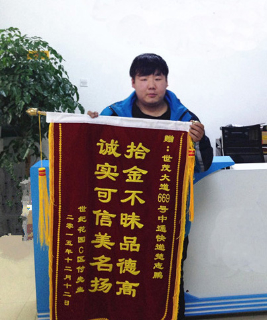 12月20日,一面寫有“拾金不昧品德高 誠(chéng)實(shí)可信美名揚(yáng)”字樣的錦旗被送到了中通快遞哈爾濱江北大學(xué)分部,失主對(duì)該分部快遞員楚志鵬無償歸還丟失錢物的行為再三表示感謝。